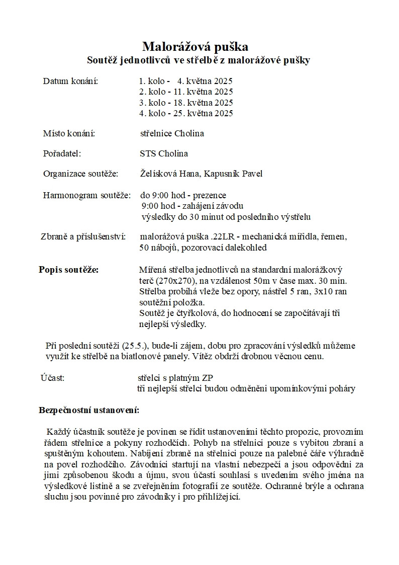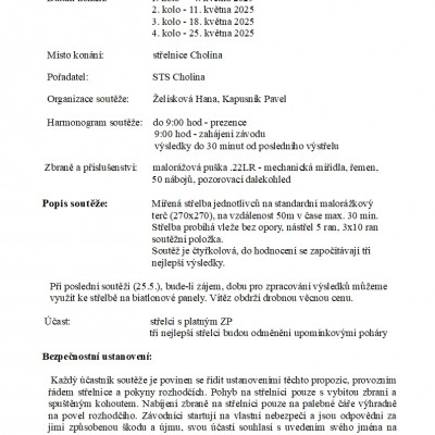 Úvod » Galerie » Pozvánka a propozice na klubovou soutěž z malorážové pušky od 04.05.2025 do 25.05.2025